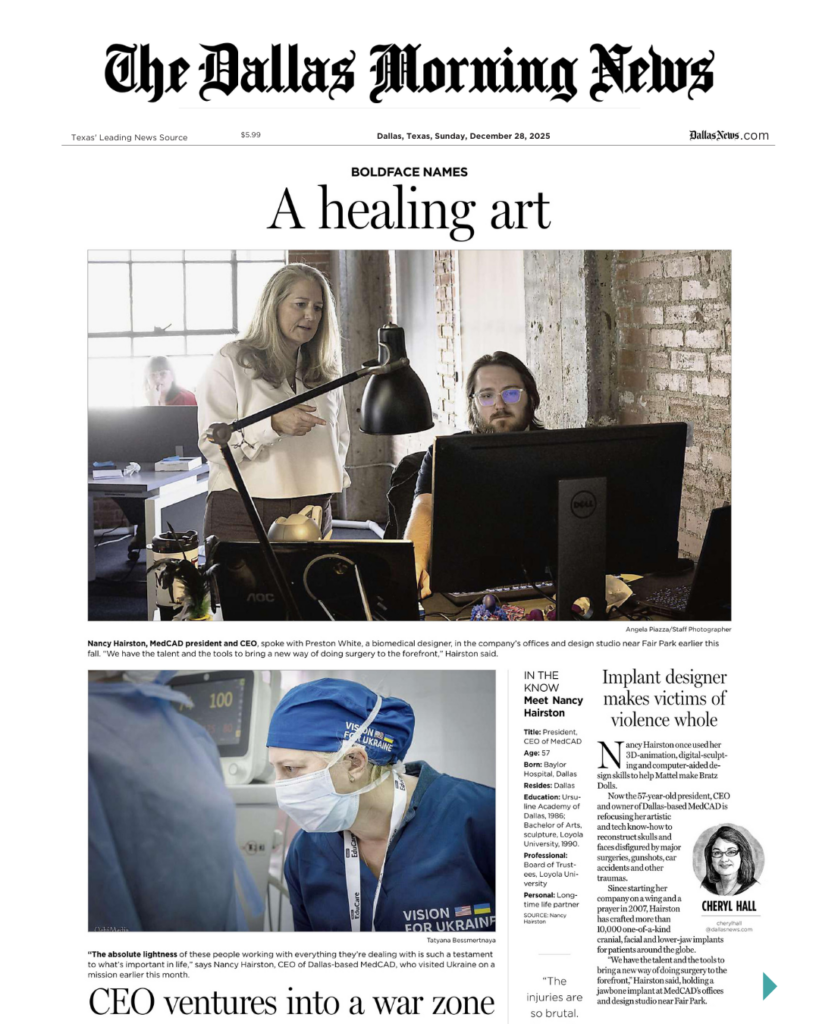 As 2025 came to a close, MedCAD was honored to be featured in The Dallas Morning News, with a profile of President and CEO Nancy Hairston appearing on the cover of the print Business section and online.